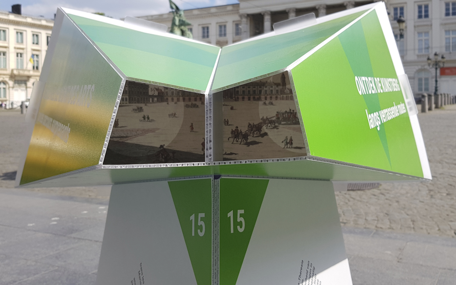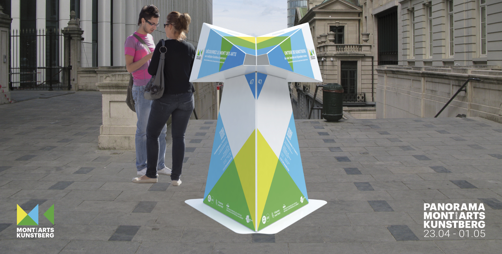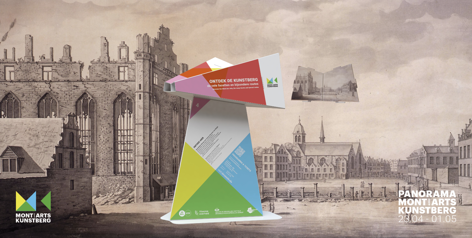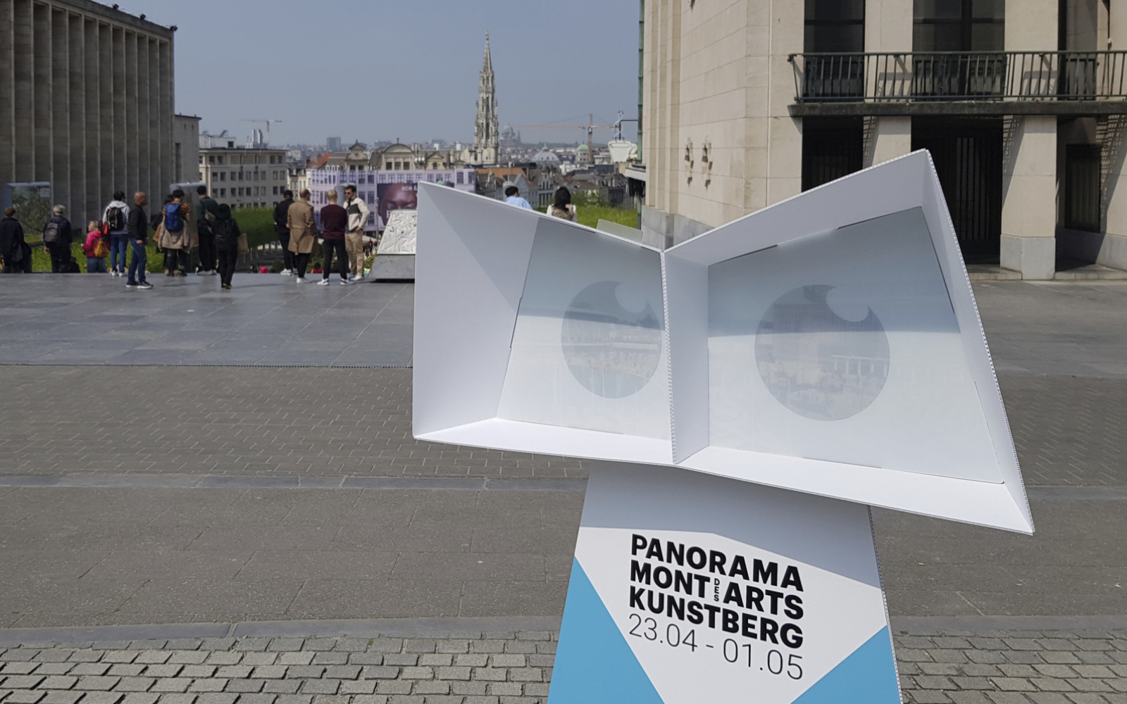 The public outdoor space of the Mont des Arts is the foundation of Panorama Mont des Arts, for which we designed the Panorama Viewer: a blank digitally printed, cut and folded 3D object that not only functions as a festival sign but also introduces visitors to interesting facts in the public outdoor space and the program of the participating institutions. Each viewer features a digitally printed translucent slide with a unique image that discloses itself when you look through the viewer.