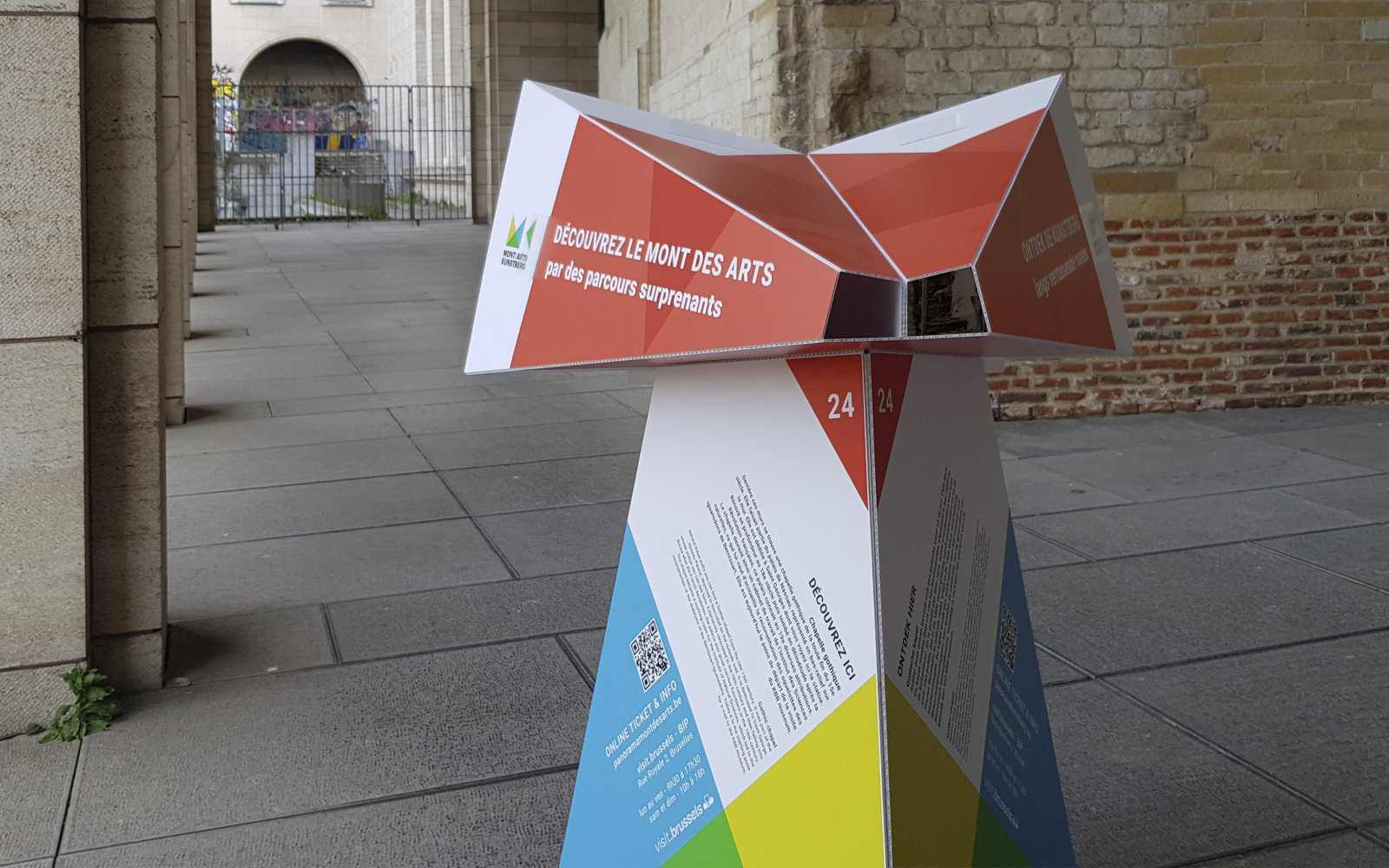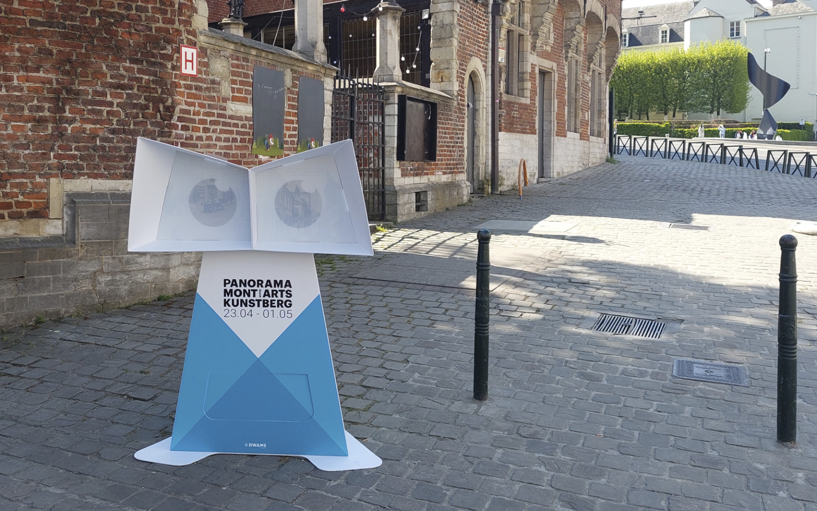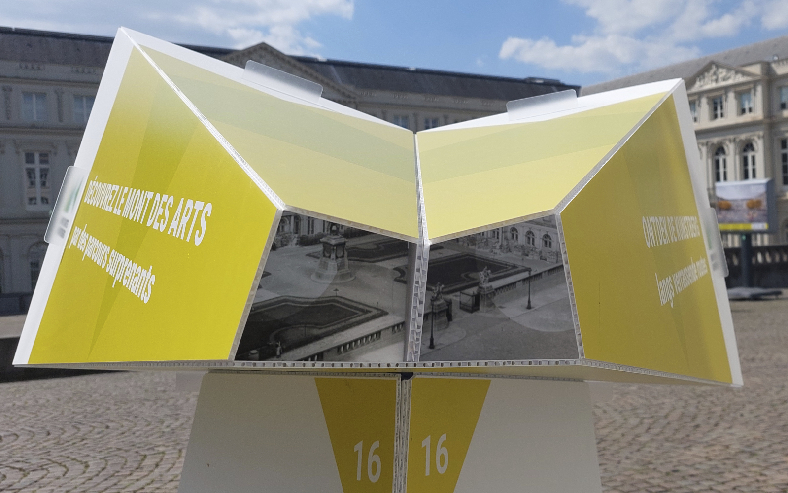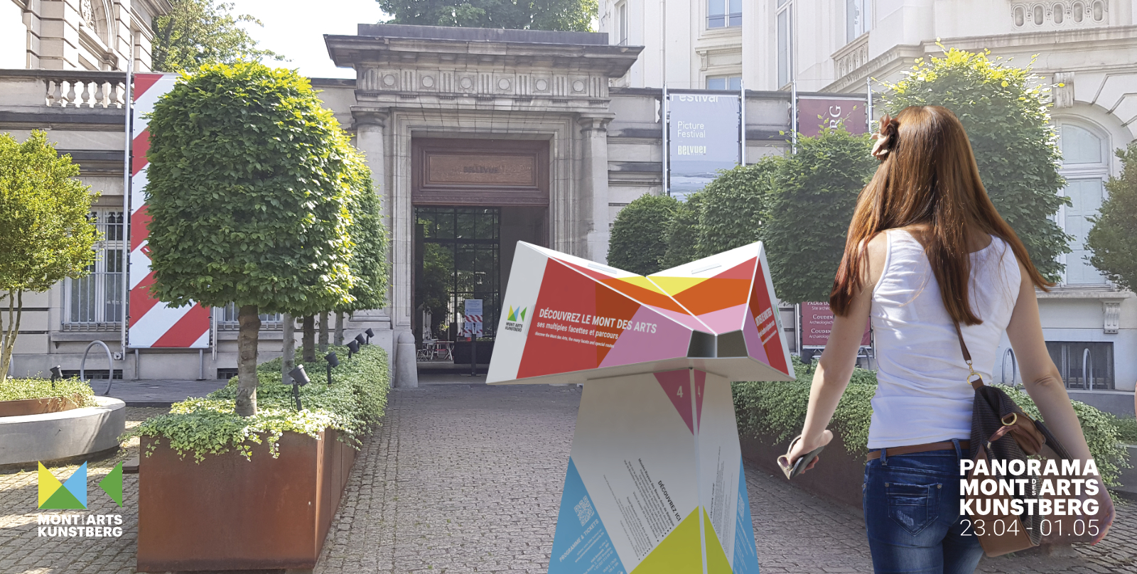 The public outdoor space of the Mont des Arts is the foundation of Panorama Mont des Arts, for which we designed the Panorama Viewer: a blank digitally printed, cut and folded 3D object that not only functions as a festival sign but also introduces visitors to interesting facts in the public outdoor space and the program of the participating institutions. Each viewer features a digitally printed translucent slide with a unique image that discloses itself when you look through the viewer.