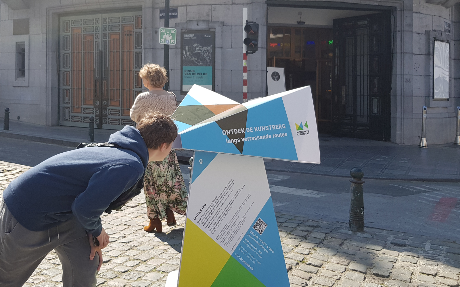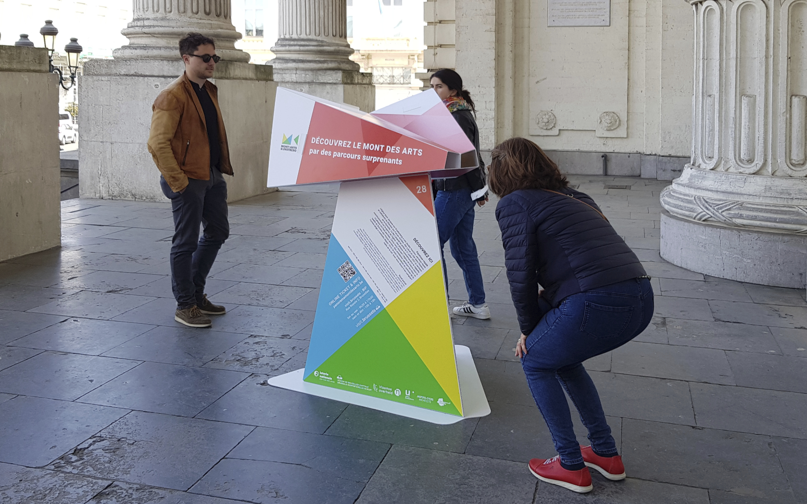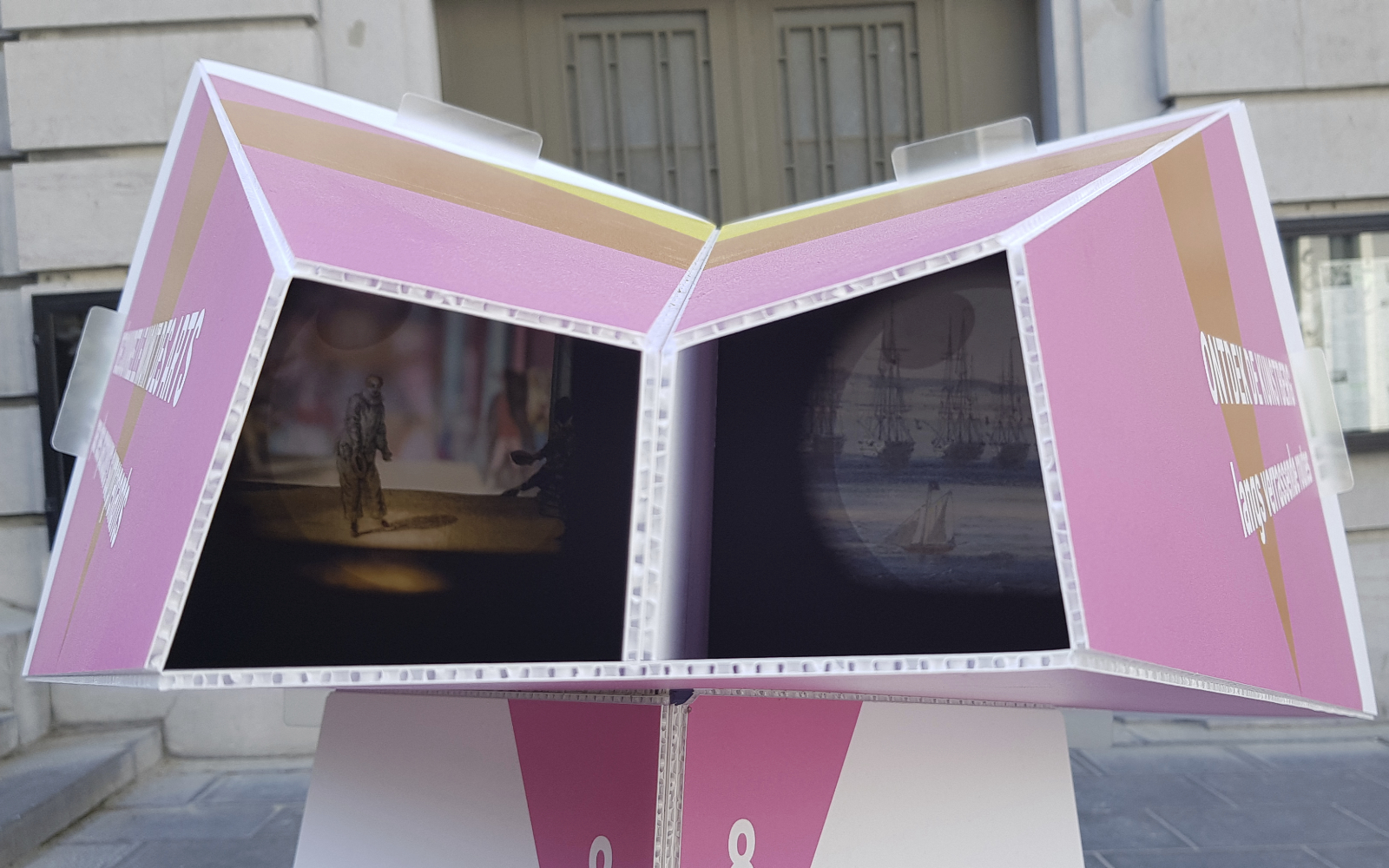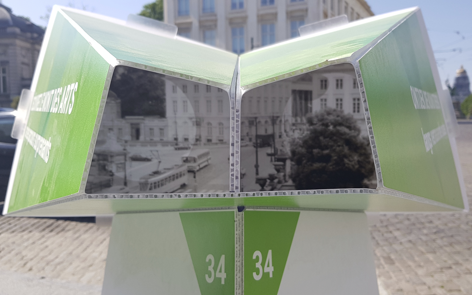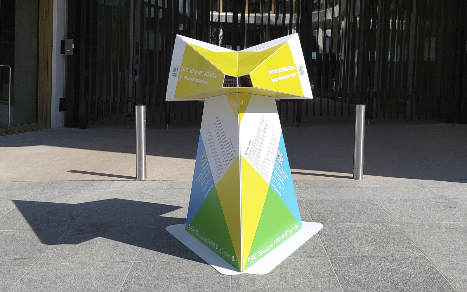 The public outdoor space of the Mont des Arts is the foundation of Panorama Mont des Arts, for which we designed the Panorama Viewer: a blank digitally printed, cut and folded 3D object that not only functions as a festival sign but also introduces visitors to interesting facts in the public outdoor space and the program of the participating institutions. Each viewer features a digitally printed translucent slide with a unique image that discloses itself when you look through the viewer.