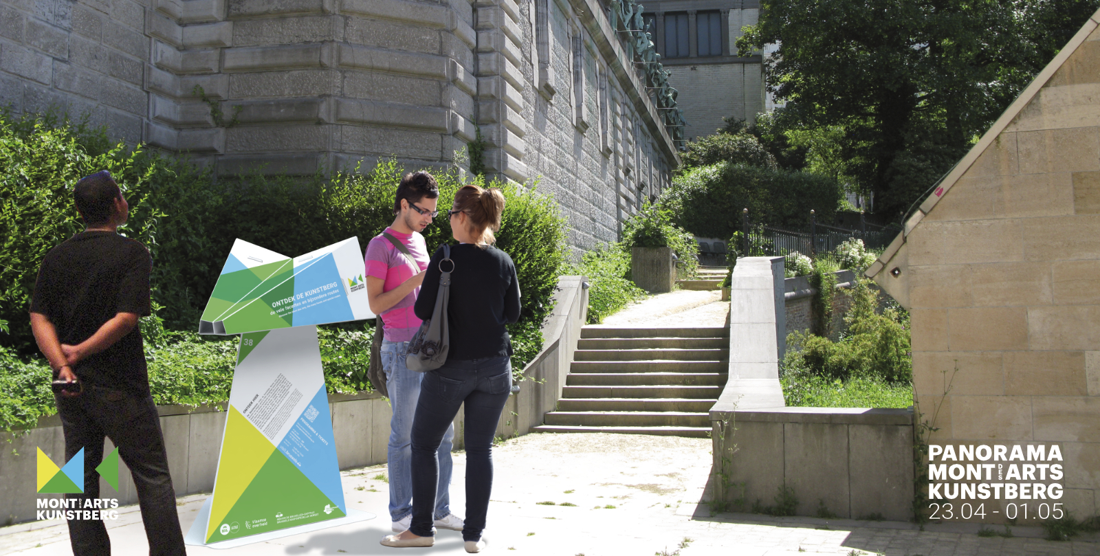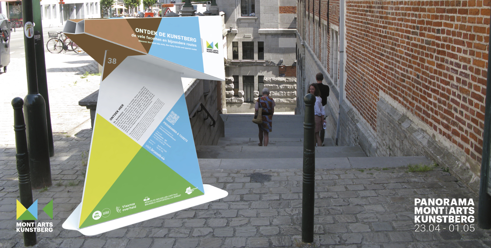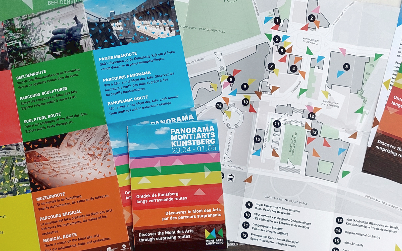 DWARS ontwerp has developed the initiative for Panorama Mont des Arts into a strong substantive and visual concept. The concept for the festival’s content is the result of creative brainstorming sessions in which connecting themes were distilled to form the basis for a balanced program. This resulted in seven themes forming the basis for the festival routes and associated programming. These routes – panoramic route, hidden route, historical route, futurist route, sculpture route, musical route and angels’ route – are a walk through the area along hotspots in the public outdoor space and corresponding programs within the participating institutions. In the communication (street banners, billboards, poster, flyer, festival map, website and media campaign), each route has a recognizable identity consisting of colour and an associative image. The large billboards on the Mont des Arts – on which all routes are introduced – form the physical centre of the festival and invite the public on the Mont des Arts to discover the festival.