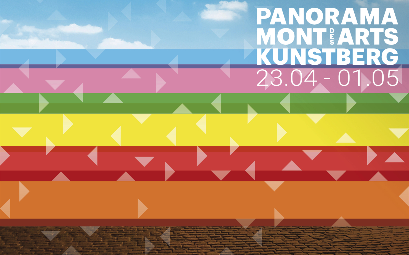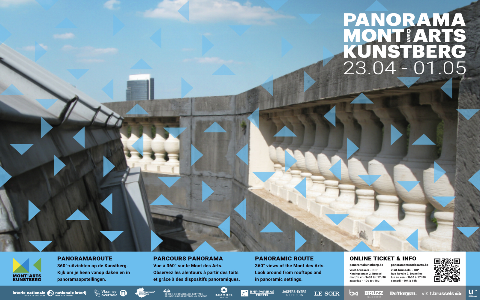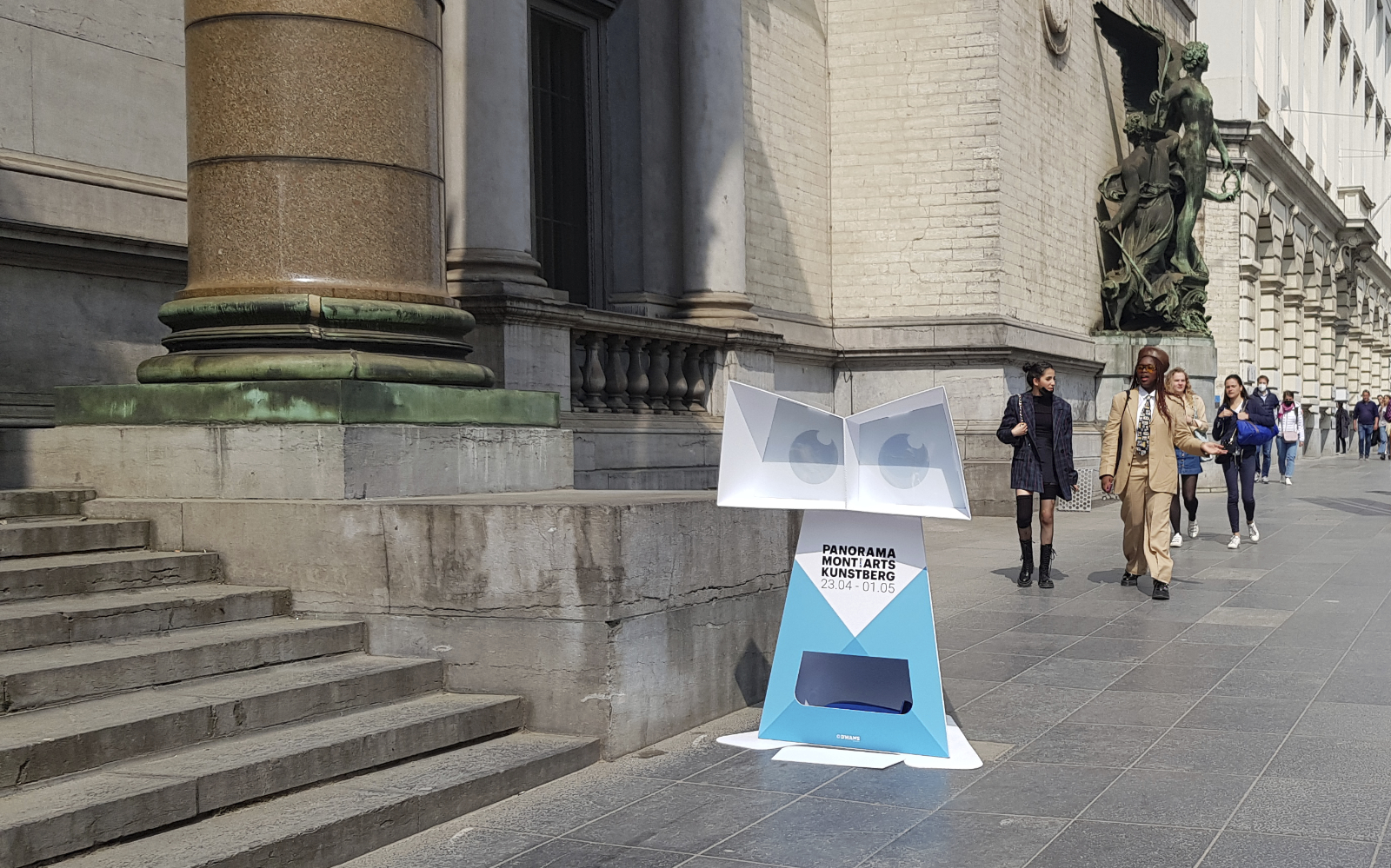 DWARS ontwerp has developed the initiative for Panorama Mont des Arts into a strong substantive and visual concept. The concept for the festival’s content is the result of creative brainstorming sessions in which connecting themes were distilled to form the basis for a balanced program. This resulted in seven themes forming the basis for the festival routes and associated programming. These routes – panoramic route, hidden route, historical route, futurist route, sculpture route, musical route and angels’ route – are a walk through the area along hotspots in the public outdoor space and corresponding programs within the participating institutions. In the communication (street banners, billboards, poster, flyer, festival map, website and media campaign), each route has a recognizable identity consisting of colour and an associative image. The large billboards on the Mont des Arts – on which all routes are introduced – form the physical centre of the festival and invite the public on the Mont des Arts to discover the festival.