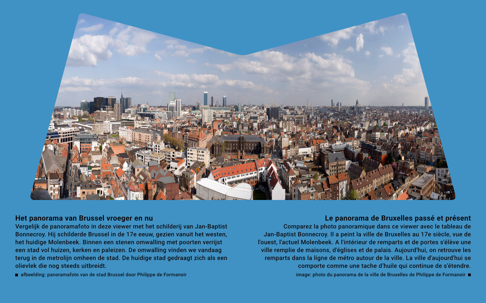 16 institutions in the area – including Royal Museums of Fine Arts Brussels (RMFAB), Bozar, BELvue Museum, Coudenberg Palace, the Musical Instruments Museum (MIM), the Cinematek, the Royal Library (KBR), Belgian National Orchestra (BNO), two monumental churches, Congress Palace Square, visit.brussels, urban.brussels and the association of Belgian companies (FEB) – have united in the non-profit association Mont des Arts. The asbl Mont des Arts aims to promote the area as an exciting urban landscape with a special history and visitor attractions on different levels. Also in a literal sense! The most photographed panorama of Brussels is actually in the heart of the area. This fact was the starting point for the first joint event: Panorama Mont des Arts, a 9-day festival in the spring of 2022 in which the institutions of the asbl Mont des Arts open their doors with surprising perspectives on the city, the area and its history and future.